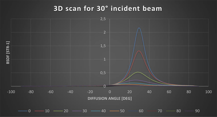 為了提高測(cè)量速度和精度,特別為裝置開(kāi)發(fā)了測(cè)控軟件,支持多種幾何條件下散射特性一次性自動(dòng)測(cè)量。首先進(jìn)行光源入射輻亮度測(cè)量,而后對(duì)樣品漫射板設(shè)定幾何條件反射輻亮度進(jìn)行測(cè)量,如此循環(huán)直***完成所有設(shè)定幾何條件的散射特性測(cè)量為止,軟件直接輸出散射特性曲線(xiàn)。